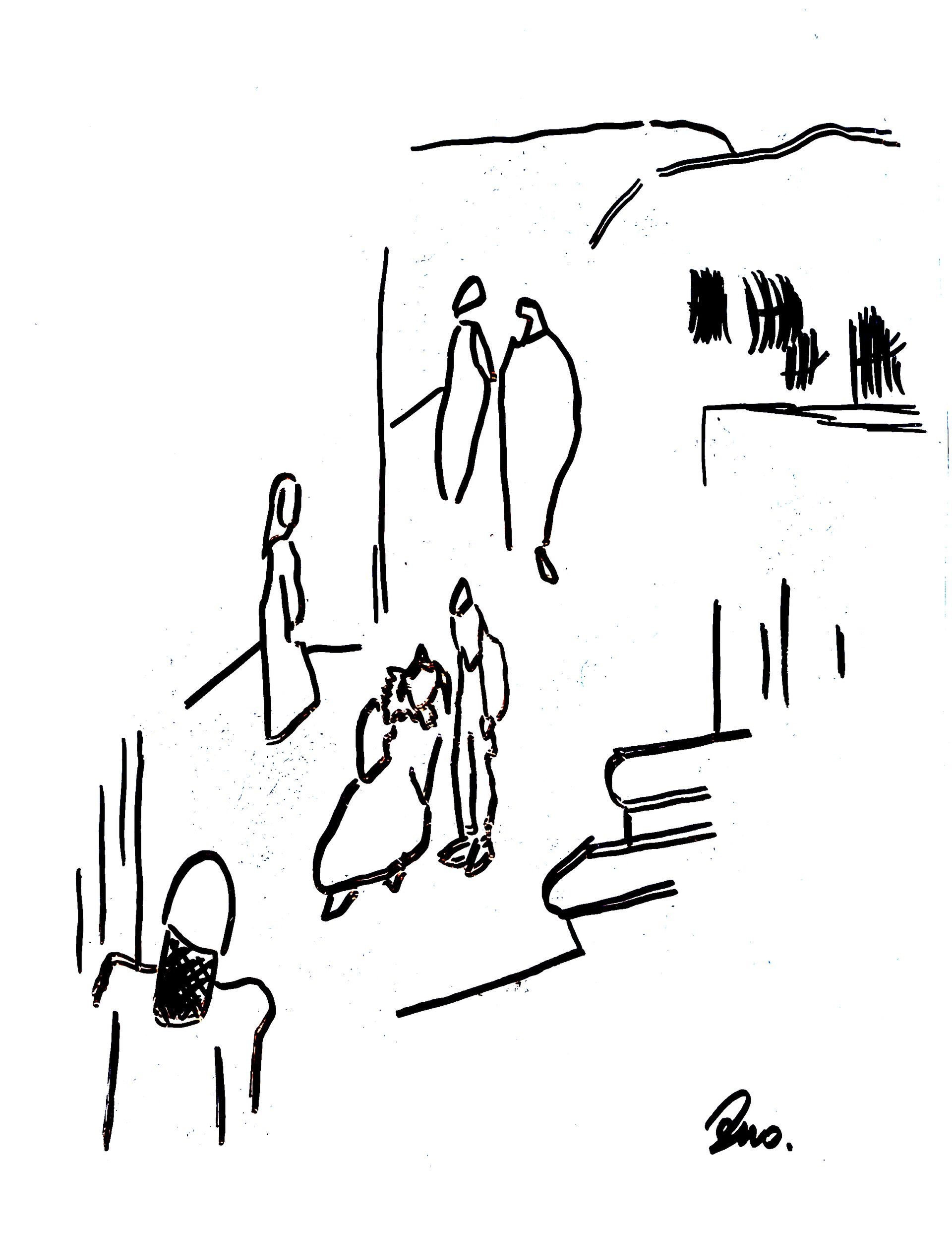 J'y vois une femme cherchant dans sa bourse des sous à donner au mendiant qui attend les mains dans les poches.